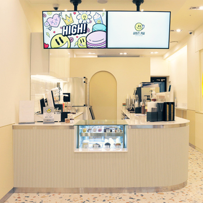 하이즈커피 송파 HIGH’S COFFEE 노란 빛의 벽과 조명이 만들어내는밝고 유쾌한 분위기 속에,스마일 로고가 공간의 포인트가 되어하루의 기분을 환하게 밝혀줍니다. 커피 한 잔의 여유에 미소가 더해지는 공간입니다. Client : HIGH’S COFFEELocation : Songpa Munjeong-dong, SeoulArea : 46㎡ (14py)Date of completion : 2021. 12 글램 313 맘마미아 청담 달마시안 도산 아치서울 용산 한양 아파트 압구정동 김해 장유동